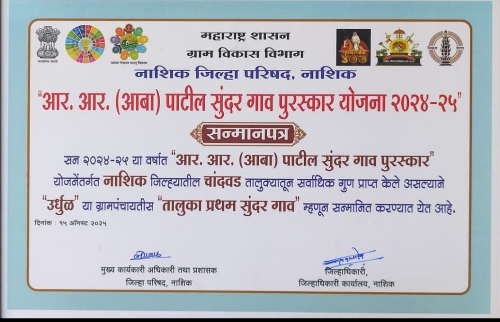उर्धुळ ग्रामपंचायतीला स्वर्गीय आर.आर. आबा पाटील स्वच्छ गांव सुंदर (स्मार्ट ग्राम) पुरस्कारात तालुका प्रथम क्रमांक