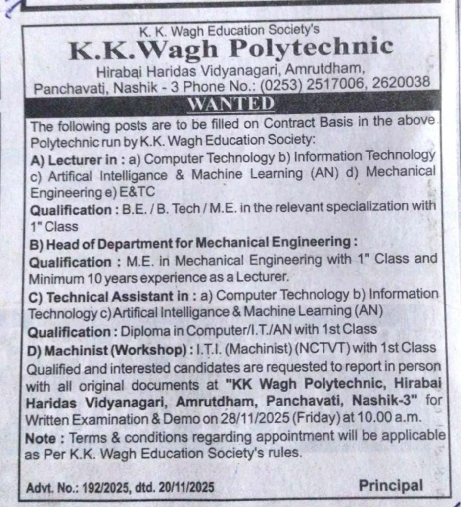 K.K. Wagh Polytechnic मध्ये विविध पदांची भरती; 28 नोव्हेंबरला परीक्ष व डेमो