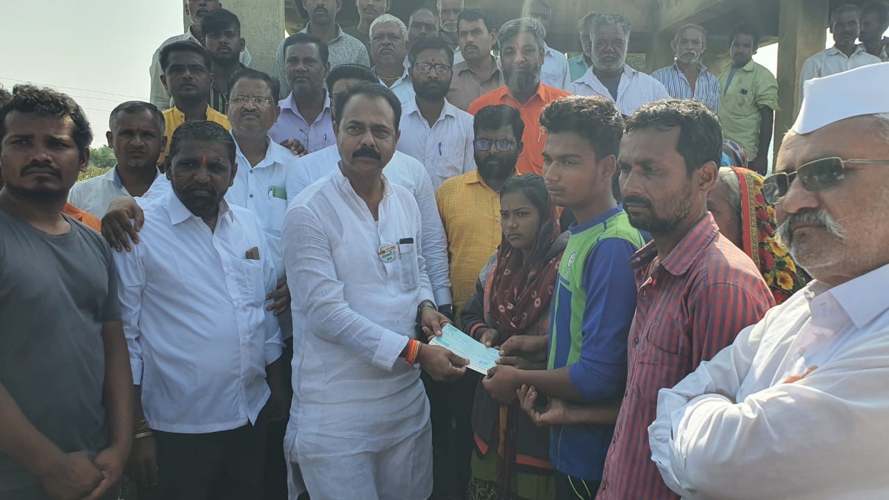 काजी सांगवी ( वार्ताहर भरत मेचकुल): महाराष्ट्र राज्याचे मुख्यमंत्री माननीय श्री एकनाथजी शिंदे साहेब यांच्या आदेशाने शिवसेना प्रणित शेतकरी सेना महाराष्ट्र प्रदेश अध्यक्ष माननीय श्री विठ्ठल राव जाधव यांनी सुरू केलेली शेतकरी संवाद यात्रा चांदवड तालुक्यात मुक्कामी आली असताना पालकमंत्री माननीय श्री दादाजी भुसे साहेब यांनी तात्काळ श्री जाधव साहेबांशी संपर्क साधून चांदवड तालुक्यातील उसवाड येथे विज कोसळून झालेल्या दुर्घटनेत मृत्युमुखी पावलेल्या शेतकरी शेतमजूर कै. सौ मीना बटाव उसवाड यांच्या कुटुंबीयास भेटण्याचे सुचना केली त्या अनुषंगाने माननीय जाधव साहेबांनी तात्काळ बटाव कुटुंबियाची उसवाड येथे राख सावरण्याचा कार्यक्रम स्मशानभूमीत चालू असताना तिथे जाऊन सांत्वन पर भेट घेऊन कुटुंबीयांचे सांत्वन केले आणि कुटुंबीयास तात्काळ एक लाख रुपयांची मदत केली तसेच माननीय मुख्यमंत्री श्री एकनाथजी शिंदे साहेबांच्या माध्यमातून शासन स्तरावर मदत मिळवून देण्याचे आश्वासनही दिले..