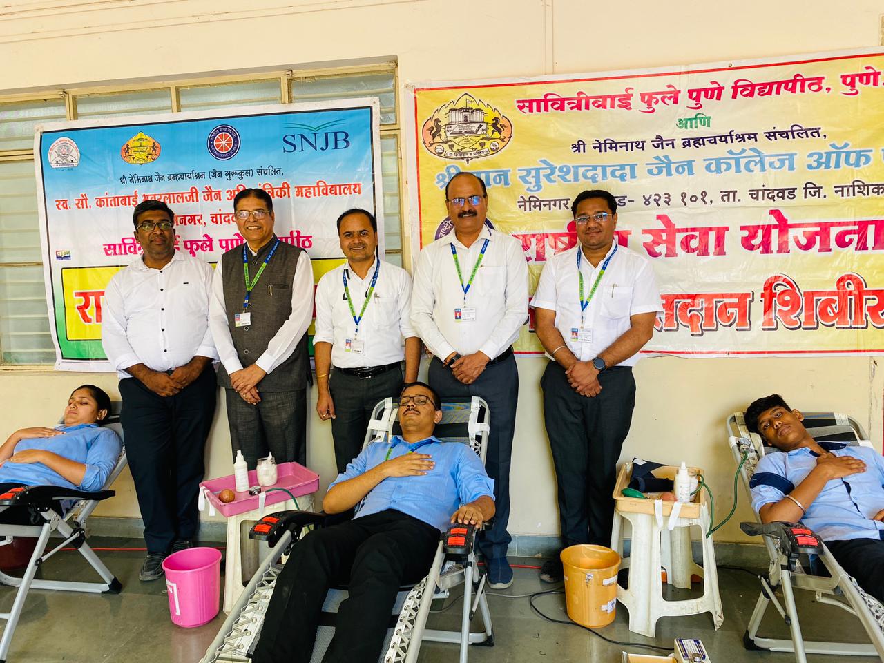 काजी सांगवी (वार्ताहर भरत मेचकुल) श्री नेमिनाथ जैन ब्रह्मचर्याश्रम (एसएनजेबी) (जैन गुरुकुल) नेमिनगर, राष्ट्रीय सेवा योजना सावित्रीबाई फुले पुणे विद्यापीठ व श्रीमान सुरेशदादा जैन कॉलेज ऑफ फार्मसी, कै. सौ. कांताबाई भवरलाल जैन कॉलेज ऑफ इंजिनिअरींग, कर्मवीर केशवलालजी हरकचंदजी आबड कला, श्रीमान मोतीलालजी लोढा वाणिज्य आणि श्रीमान पि. एच. जैन विज्ञान महाविद्यालय यांच्या संयुक्त विद्यमाने नवरात्रीचे अवचित्य साधून जनकल्याण रक्तपेढी नाशिक यांच्या सहयोगाने भव्य रक्तदान शिबिर आयोजित करण्यात आले होते. या प्रसंगी एसएनजेबी संस्थेच्या महाविद्यालयांचे प्राचार्य. डॉ.सी.डी.उपासनी, डॉ.आर.जी. ताथेड, डॉ.दत्ता शिंपी यांनी शिबिराचे उद्घाटन केले. रक्तदान शिबिरात ६० दात्यानी यशस्वीरीत्या रक्तदान केले. कार्यक्रम यशस्वीतेसाठी रा.स.यो. कार्यक्रमप्रमुख प्रा. भावेश अमृते, प्रा.दिपेश अग्रवाल, प्रा.सोहनी, प्रा.आवारे यांनी मेहनत घेतली. संस्थेच्या विश्वस्त मंडळाचे अध्यक्ष श्री.बेबीलालजी संचेती, उपाध्यक्ष श्री.दिनेशकुमारजी लोढा, प्रबंध समितीचे अध्यक्ष श्री. अजितकुमारजी सुराणा व उपाध्यक्ष श्री.अरविंदकुमारजी भंन्साळी. महाविदयालयाचे समन्वयक व प्रबंध समितीचे सहमानद सचिव श्री.झुंबरलालजी भंडारी, समन्वयक ॲड.प्रकाशचंदजी बोकडिया व संस्थेचे प्रशासकीय अधिकारी श्री. पी.पी.गाळणकर तसेच संस्थेच्या विश्वस्त मंडळ व प्रबंध समितीच्या इतर सर्व सदस्यांनी सदर उपक्रमाबद्दल संस्थेच्या महाविदयालयीन आयोजनकर्त्यांचे मन:पूर्वक अभिनंदन केले.