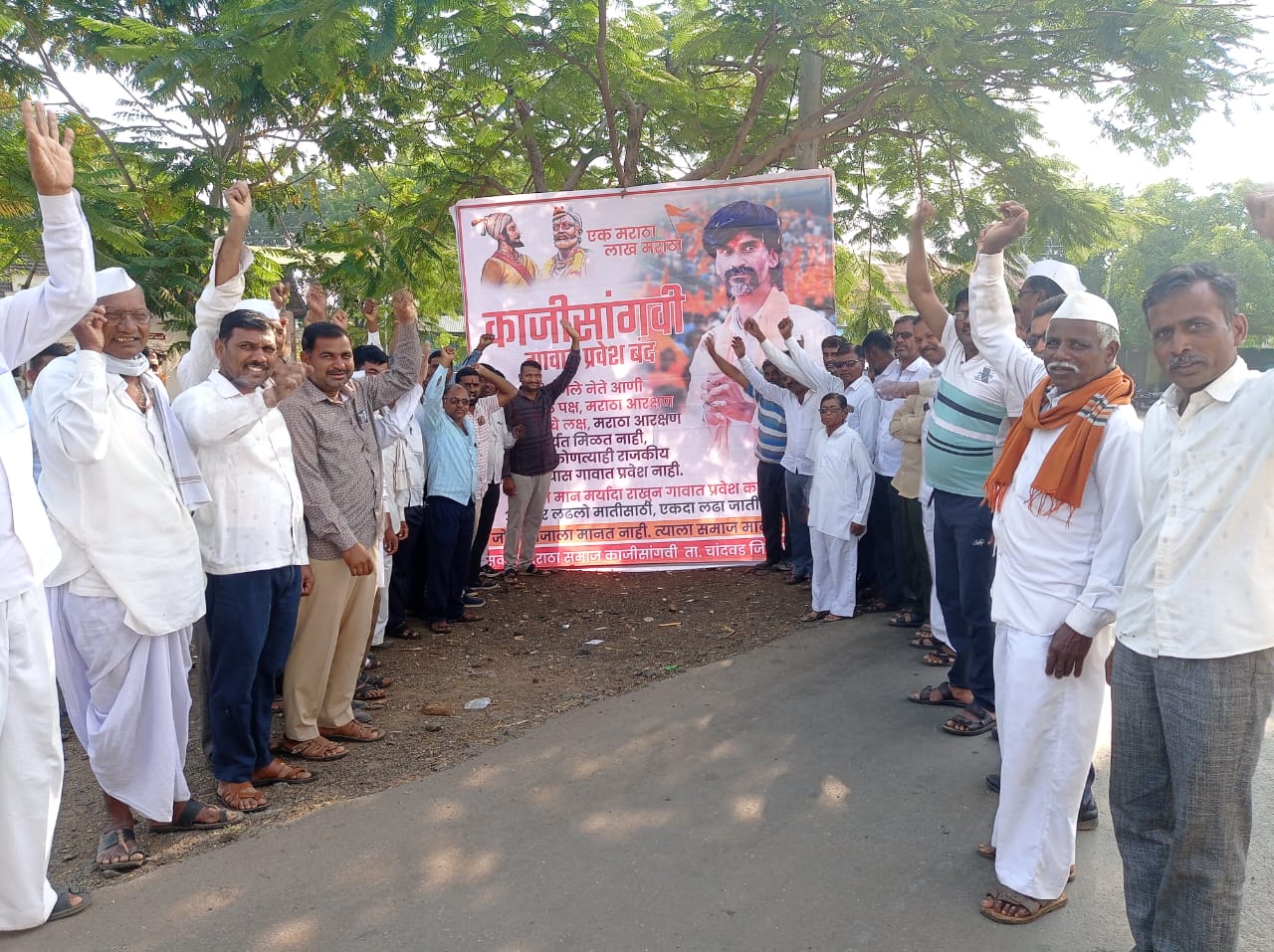 काजीसांगवी (दशरथ ठोंबरे) :-चांदवड तालुक्यातील ग्रामीण भागात ठिकठिकाणी दि 31रोजी मराठा समाज आरक्षण मिळण्यासाठी “एक मराठा लाख मराठा “”आरक्षण आमच्या हक्काचे नाही कुणाच्या बापाचे”अशा घोषणा देत ग्रामीण भागातील जनतेने कडकडीत बंद पाळलासकल मराठा समाजाला सरसकट कुणबी म्हणून मी आरक्षण मिळत नाही तोपर्यंत सर्व राजकीय पक्षांतील नेत्यांना व सचिवांना गावात प्रवेश बंदी करण्यात आली असून असे फलक ही गावागावात लावण्यात आले आहे. तसेच काजीसांगवी येथिल दि 31रोजी सकाळी मराठा समाज बांधवानी आरक्षणावर घोषणा देत गाव बंद हाक देत निषेध केला. व्यवसायकानी कडकडीत बंद पाळत आदोलनात सामील झाले. याबाबतचा सरपंच कल्पना ठाकरे व सदस्य यांनी ठराव करुन याबाबचे निवेदन तहसीलदार यांना देण्यात आले. शांततेच्या मार्गाने आंदोलन करुन मनोज जरांगे पाटील यांनी सांगितल्या प्रमाणे काजीसांगवी गावात राजकिय नेत्याना गाव बंद करण्यात आले आहे. तसेच कोलटेक फाटा येथे भागवत ठोके, इस्माईल शेख ,दादा ठोके, यासीन शेख ,पवन ठोके ,संजय निंबाळकर ,सोमा आरगडे, दगा ठोके, शंकर खांगाळ, हेमराज चव्हाण ,पिंटू ठोके ,विकास शिंदे ,योगेश ठोके, विलास गोधडे ,मंगेश चव्हाण, नवीन ठोके ,योगेश खंगाळ, गुणवंत ठोके, हर्षद आहेर ,दादा भुतनार, नवनाथ ठोके, संदीप गवळी, संदीप जाधव, बाळू खांगाळ ,अशोक कासव, संदीप गावडे ,संजय ठोके ,सुभाष खांगाळॆआदि ग्रामस्थानी एकत्र येऊन विंचूर प्रकाशा रोड वरती “एक मराठा लाख मराठा ” ‘आरक्षण आमच्या हक्काचे नाही कोणाच्या बापाचे ‘ “जरांगे पाटील आगे बढो हम तुम्हारे साथ है “अशा घोषणा देत टायर जळत काही काळ आंदोलन केले निषेध केला. तसेच तळेगावरोहीसह गटातील साळसाणे, दिघवद, पिपंळद, , काळखोडे, वाकी, वाहेगावसाळ, वाळकेवाडीफाटा, निंबाळे, विटावे ,गंगावे, हिवरखेडे,साळसाणे, वागदर्डी, आदी गावात कडकडीत बंद पाळण्यात आला.