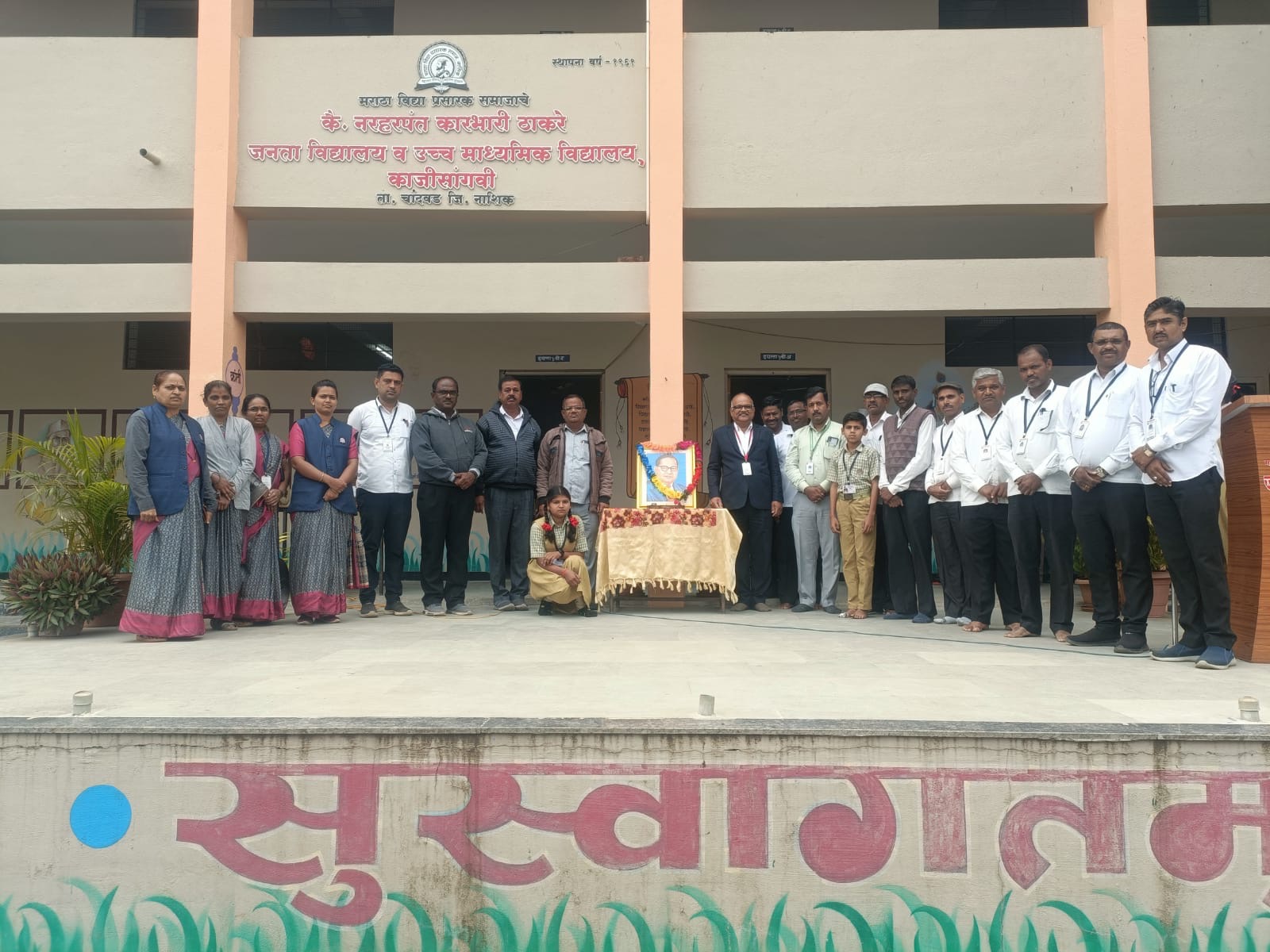 काजीसांगवीः(उत्तम आवारे) मराठा विद्या प्रसारक समाजाचे कै नरहरपंत कारभारी ठाकरे जनता माध्य व उच्च माध्यमिक विद्यालय काजीसांगवी येथे महापरिनिर्वाण दिनानिमित्ताने भारतरत्न डॉ.बाबासाहेब आंबेडकर यांना विनम्र अभिवादन करण्यात आले. कार्यक्रमाच्या अध्यक्षस्थानी विद्यालयाचे मुख्याध्यापक चित्तरंजन न्याहारकर होते.समवेत व्यासपीठावर सेवक संचालक जगन्नाथ निंबाळकर ,पर्यवेक्षक सुभाष पाटील ,आरोग्य विभाग समन्वयक प्रविण वाघ आदी मान्यवर उपस्थित होते.