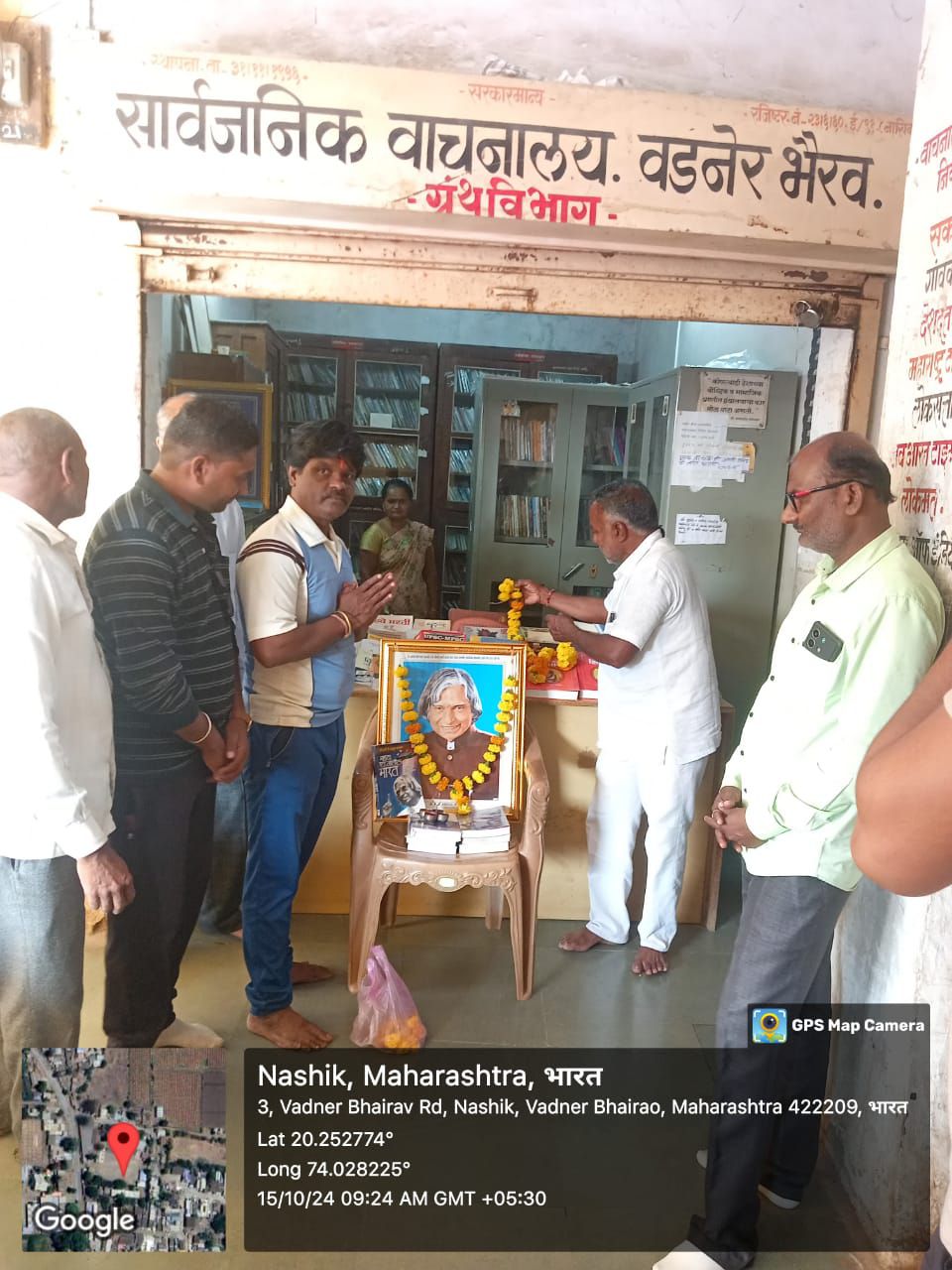 कैलास सोनवणे (पत्रकार) : सरकार मान्य सार्वजनिक वाचनालय वडनेरभैरव येथे डॉ. एपीजे अब्दुल कलाम यांची जयंती व वाचन प्रेरणा दिन मोठ्या उत्साहात साजरा करण्यात आला. या विशेष प्रसंगी कवी लेखक रत्नाकर पांडव आणि डॉ. सुनील आहेर यांच्या हस्ते डॉ. एपीजे अब्दुल कलाम यांच्या प्रतिमेचे पूजन करण्यात आले. वाचनालयाचे सरचिटणीस चंद्रकांत मामा भंडारे यांनी या कार्यक्रमाचे आयोजन केले होते.