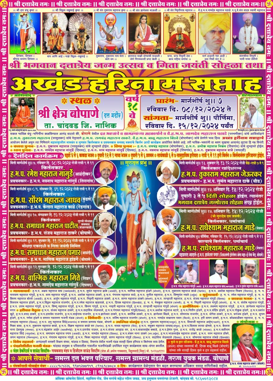बोपाणे येथे दत्तात्रय जन्मोत्सवानिमित्ताने सालाबादप्रमाणे अखंड हरिनाम सप्ताहाचे आयोजन करण्यात येते रविवार दि.8/122024 ते 15/12/2024या कालावधीत संपन्न झाला वर्ष १८वे वै.ह.भ.प.नामदेवमहाराज पठाडे यांच्या आशीर्वादाने दि.आठ रोजी पहाटे तुकाराम महाराज यांच्या हस्ते कलश पुजण करण्यात आले तर विणा पुजण रामचंद्र महाराज व अशोक महाराज यांच्या हस्ते करण्यात आले व ध्वज पुजण नामदेव महाराज गांगुर्डे व शाम महाराज नवनाथ महाराज तुकाराम महाराज वाजे यांच्या हस्ते करण्यात आले. पहाटे चार ते सहा काकडा भजन दुपारी बारा ते एक गाथा भजन सायंकाळी सहा ते सात हरी पाठ व रात्री नऊ ते अकरा किर्तनाचे आयोजन करण्यात आले यावेळी हे.भ.प. रमेश महाराज आळंदीकर सौरभ महाराज कुंडाणेकर समाधान महाराज पाटील समाधान महाराज आळंदीकर वाल्मिक महाराज गिते तुकाराम महाराज जेऊरकर राधेश्याम महाराज गाडे यांचे किर्तन संपन्न झाली तर दि. १५ रोजी सकाळी राधेश्याम महाराज यांचे काल्याचे किर्तन संपन्न झाले या कार्यक्रमाला प.पु. स्वामी जयदेव पुरी महाराज चंद्रशेवर गड चांदवड व वैराग्य मूर्ती तुकाराम महाराज जेऊरकर यांचे आशीर्वाद लाभले या सप्ताहात नांदगाव चांदवड येवला व जिल्ह्यातील नामवंत किर्तन कार प्रवचनकार भाविक भक्त उपस्थित होते या सप्ताहाला समस्त दत्त भक्त परिवार समस्त ग्रामस्थ बोपाणे व दिघवद तरुण युवक मंडळाने परिश्रम घेतले.